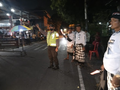 Terpantau Personel Polri Polsek Blahbatuh bersama Pecalang setempat turun ke jalan memberikan pelayanan kepada masyarakat meliputi kegiatan pengaturan lalu lintas dan parkir serta mengawal rangkaian kegiatan dari awal hingga akhir.